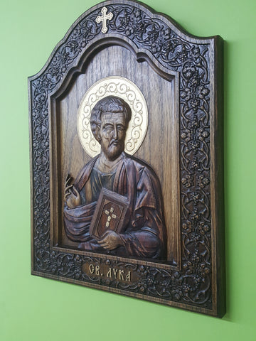 Ikona Sveti Luka izradjena od hrasta dimenzija 50cm x 39cm x 3cm. Ikona je izrađena od hrastovog drveta, bajcovana u orah i zaštićena prirodnim uljem i pčelinjim voskom. Mogućnost izrade po Vašoj želji i od raznih vrsta drveta. Imajte nešto posebno u svojoj kući.